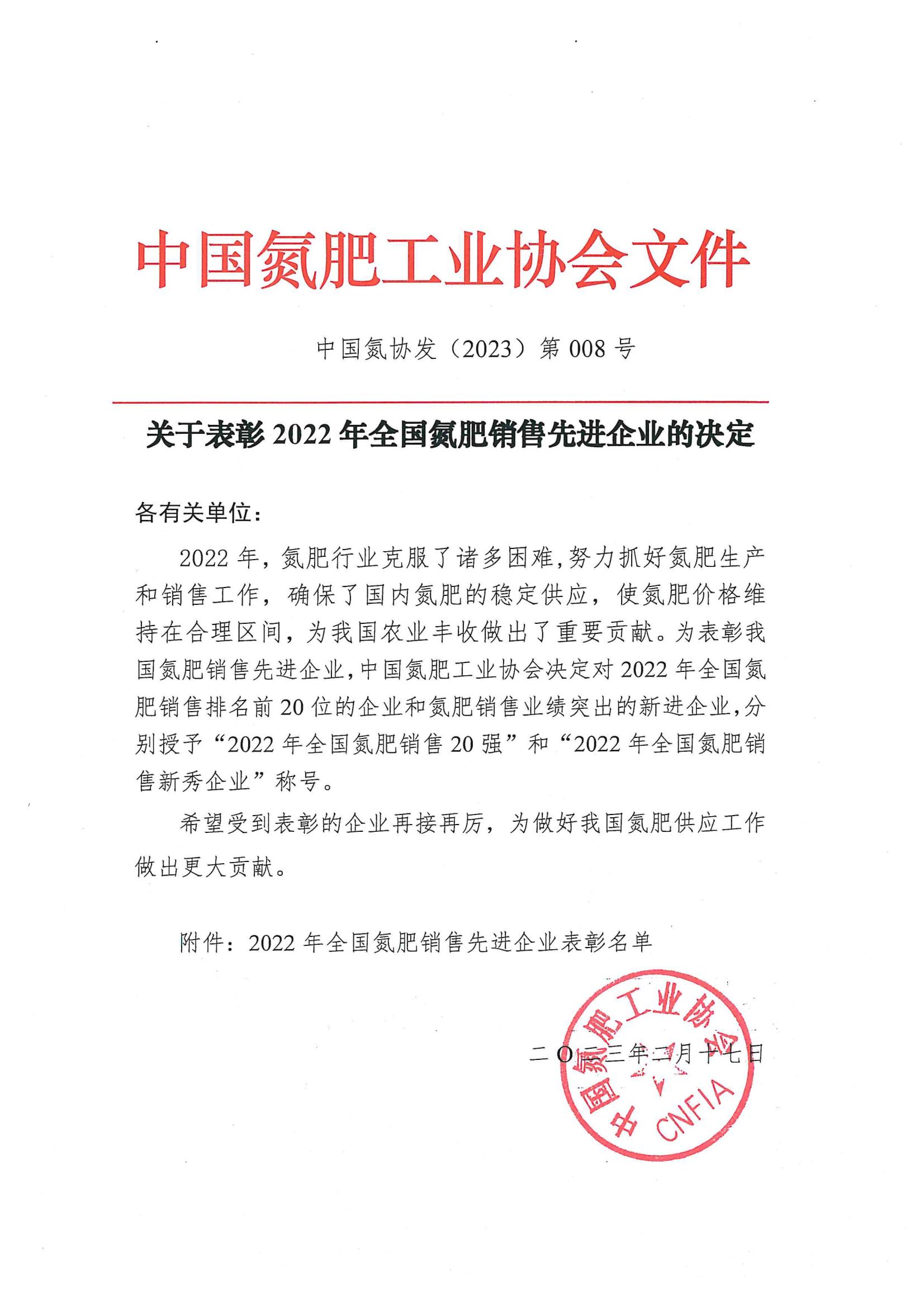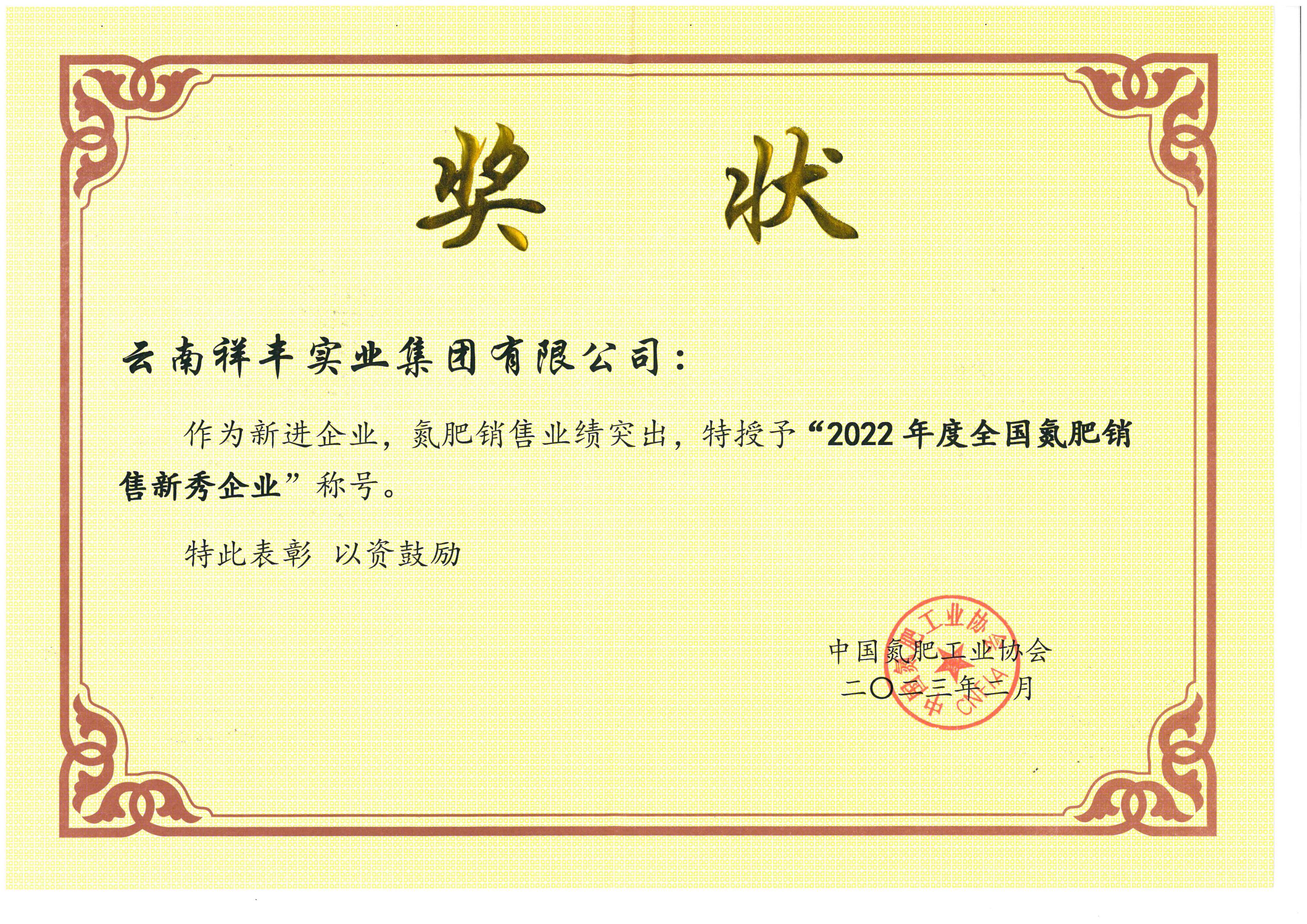 榮獲“2022年度全國(guó)氮肥銷售新秀企業(yè)”稱號(hào)